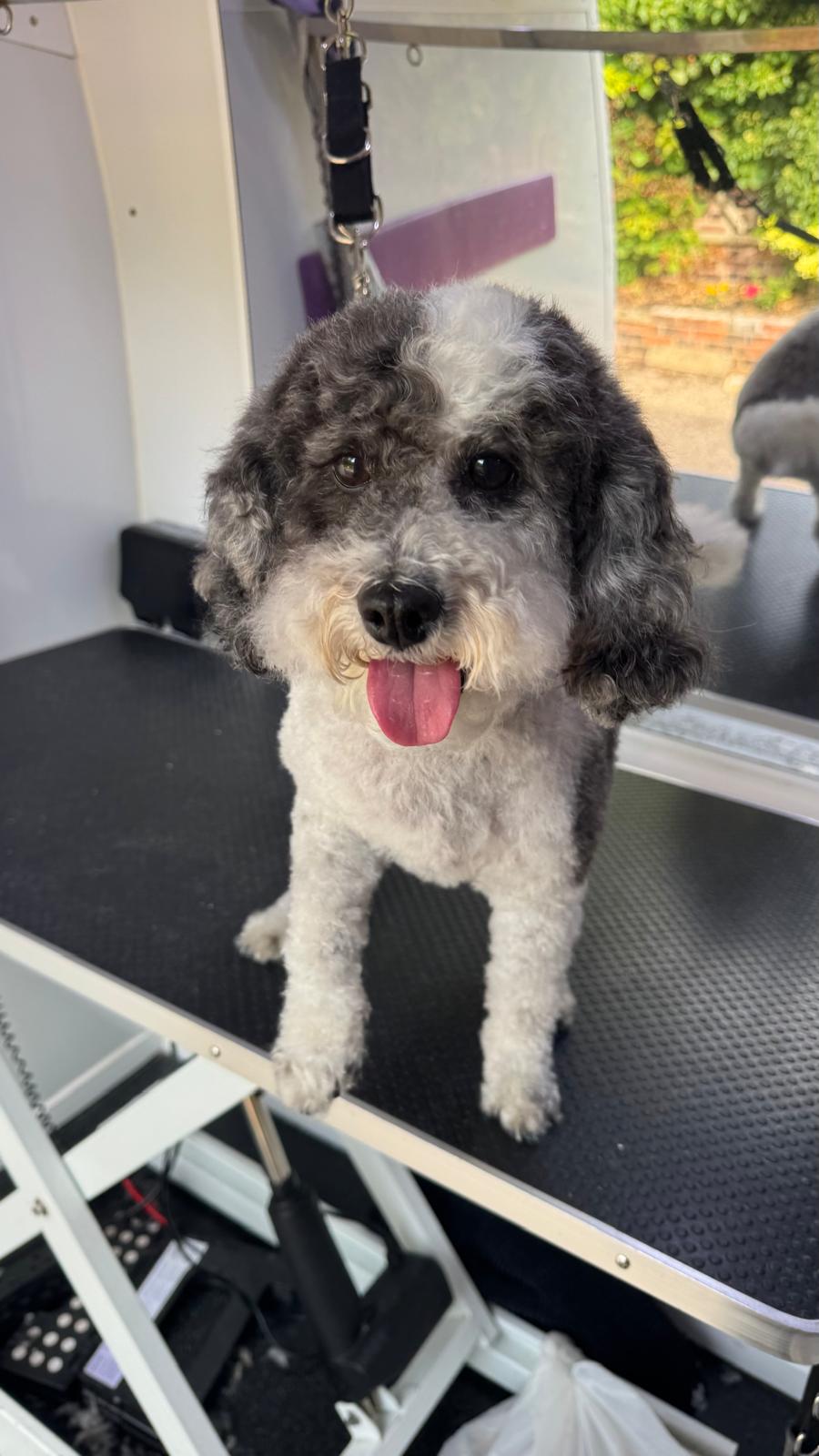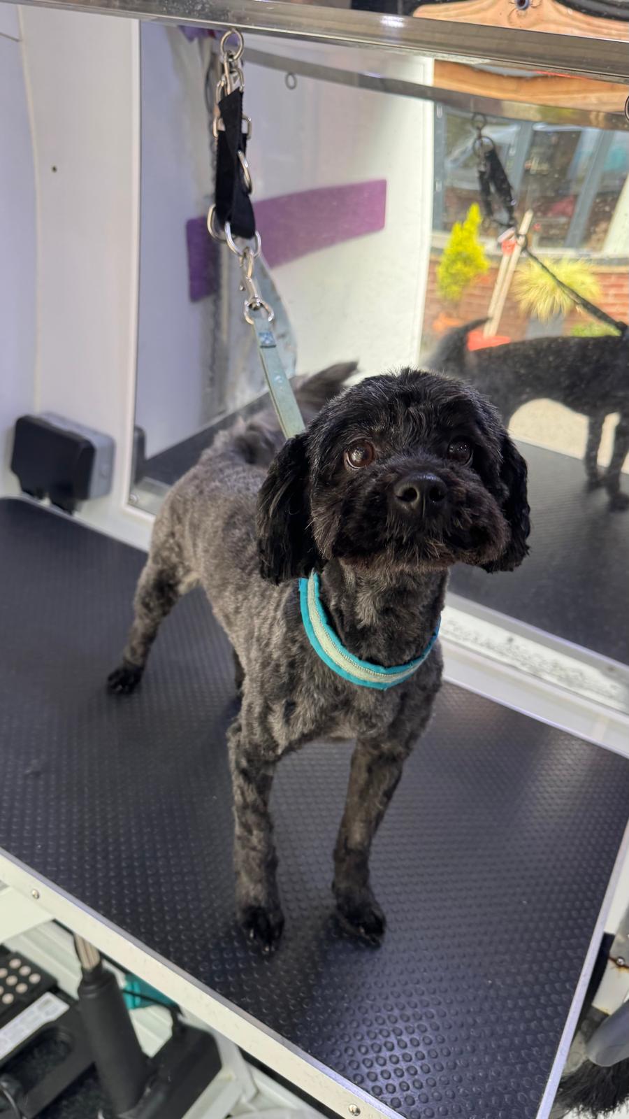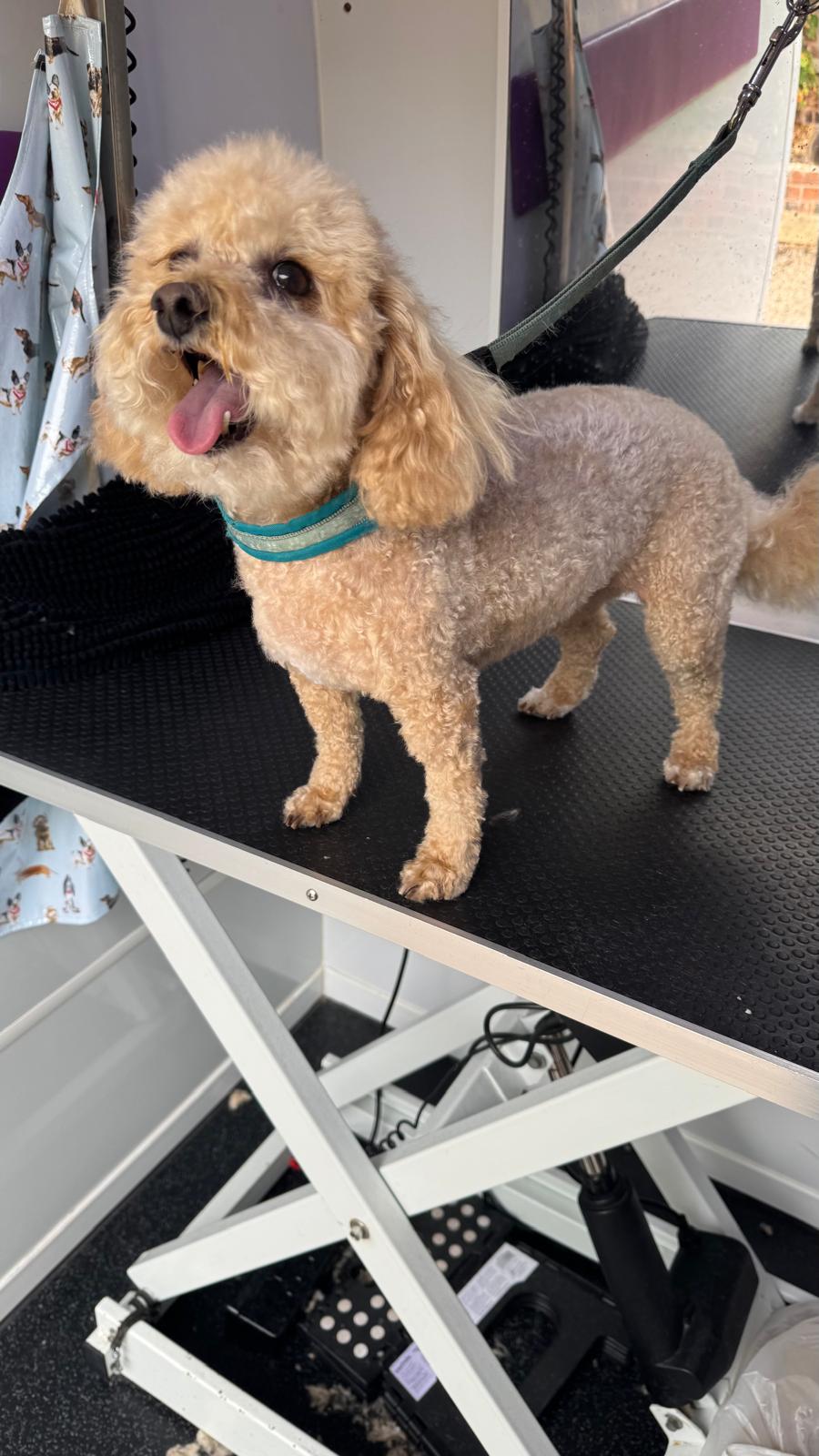Gentle and patient — this nervous little Cockapoo faced his fears and came out looking great, even without leg touches